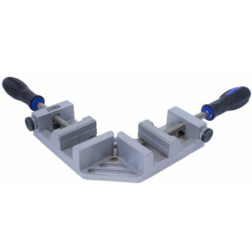 Yost Model R25 is a 2.5" Right Angle Clamp. It is a durable aluminum tool that is very effective for making cabinets or box-frames, and functions as a third hand for the every handyman. It's useful function of an assembly aid helps in the alignment and clamping of parts for nailing, welding, and screwing. The clamp's ergonomic handles and quick-release mechanism allow for easy adjustments, while the 2-1/2-inch jaw capacity handles most clamping jobs. A 3-inch clamp face with V-groove design is also included to hold round materials.